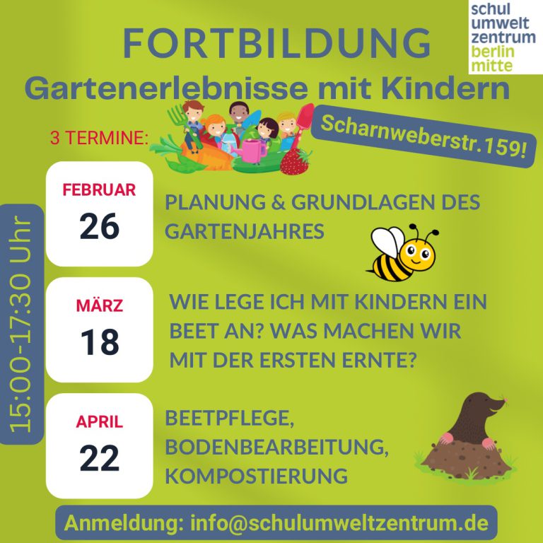 Raus aus der Kita oder dem Klassenzimmer und rein in die Natur! Das ist ein toller Vorsatz für 2024. Meldet euch schnell für unsere diesjährige Fortbildungsreihe an. Und bucht dazu gleich ein Beet für das neue Gartenjahr im Schul-Umwelt-Zentrum Mitte. Bestellungen für Saatgut und Jungpflanzen für den eigenen Schulgarten nehmen wir bis Ende Januar an!